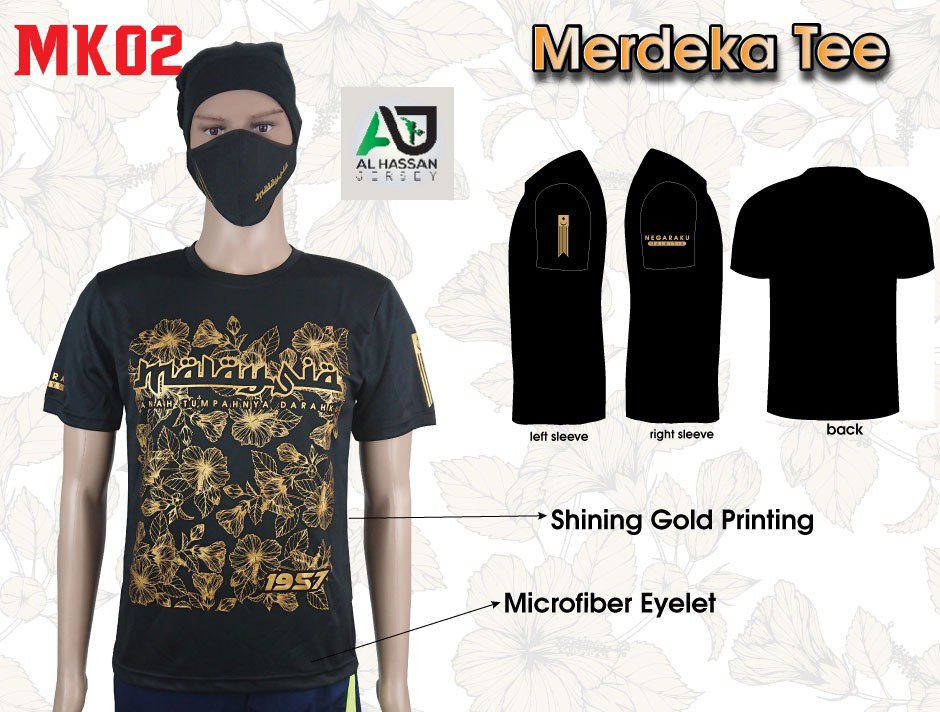 Material kain MICROFIBER EYELET, cetakan shining GOLD. Kiri & kanan lengan juga ada cetakan. Nampak lebih PREMIUM.