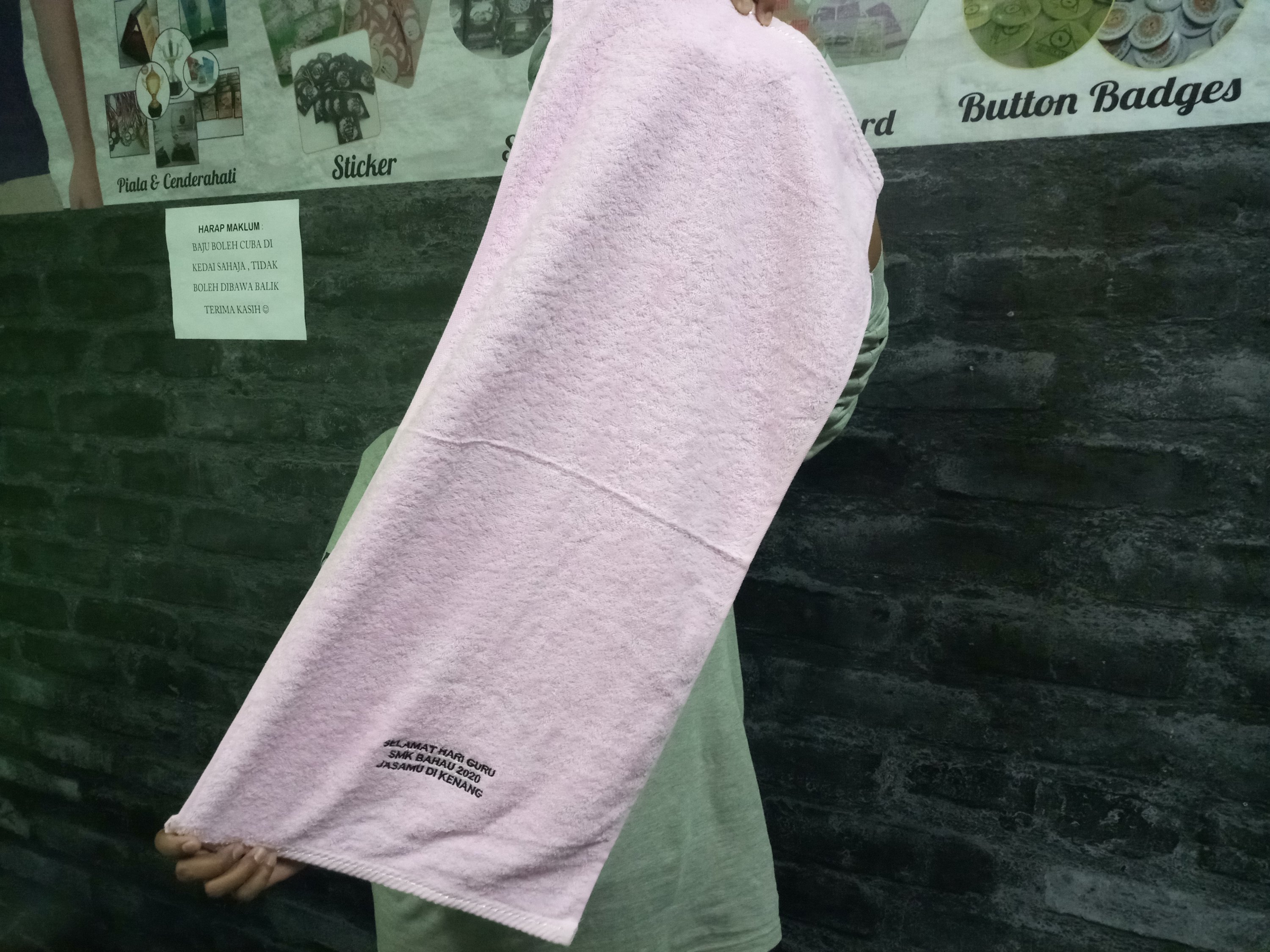 Tuala ni ada dua saiz, tuala mandi & tuala muka. Ikut bajet tuan tuan. Kemudian boleh tambah sulam, tulis nama ke atau tulis penghargaan ke. Kalau sulam paling cantik dan kami rekemen la sebab tahan lama. Jika bajet kurus boleh print sahaja.❤