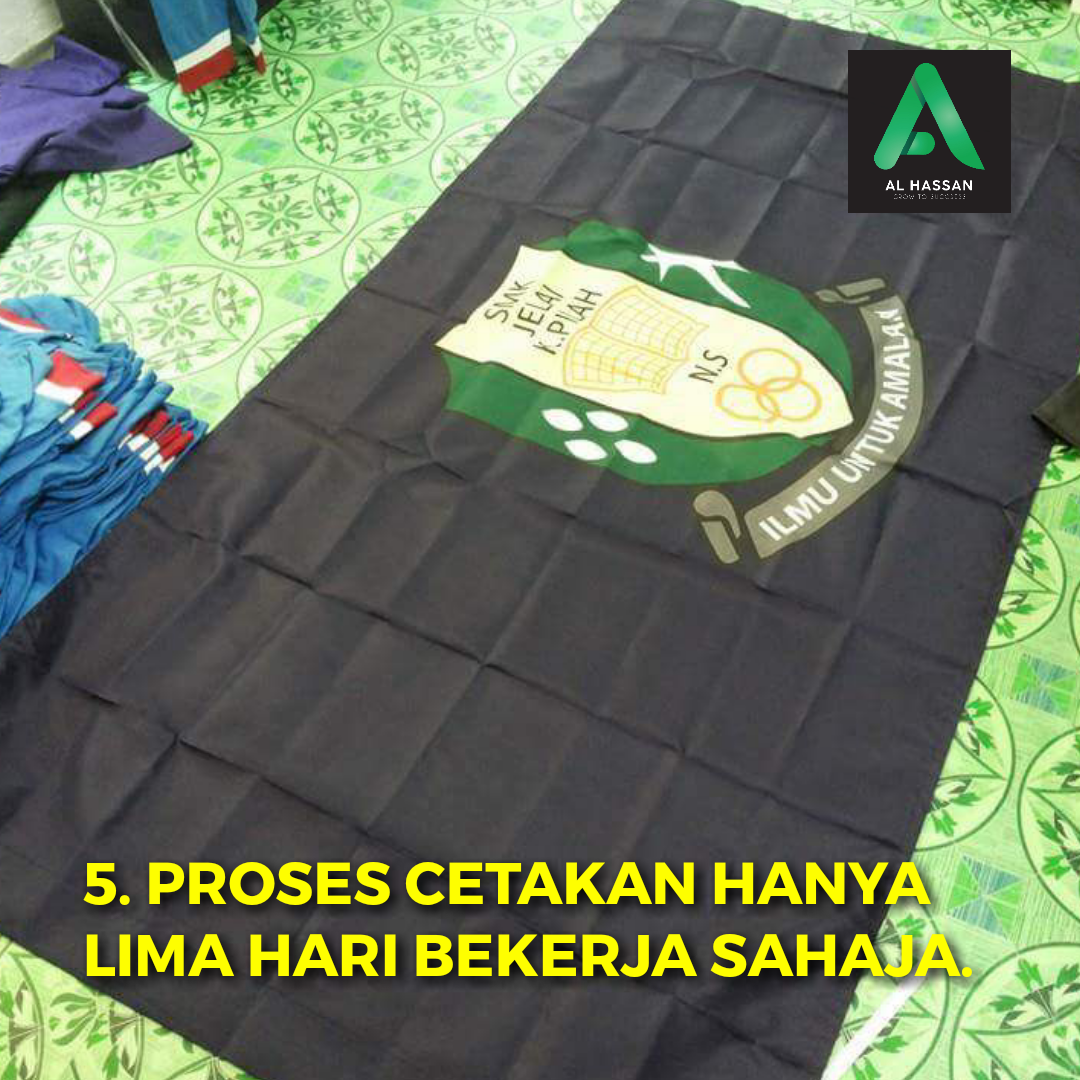Selalunya tempoh masa proses cetakan satu bendera hanya lima hari bekerja sahaja selepas cikgu setuju dengan artwork.