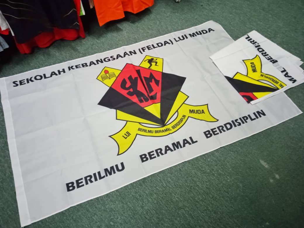 Cetakan ‘full colour’, maknanya tak kisah berapa banyak warna logo sekolah cikgu tu. Begitu juga warna latar belakang bendera, tiada limit warna.
