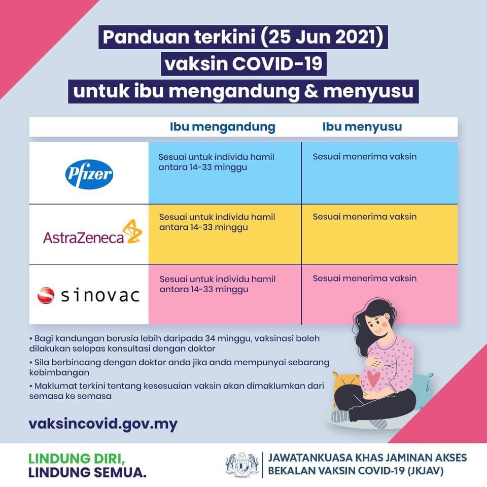 Semua vaksin di Malaysia(Pfizer,Astrazeneca dan Sinovac) sesuai untuk ibu mengandung dan ibu menyusu.