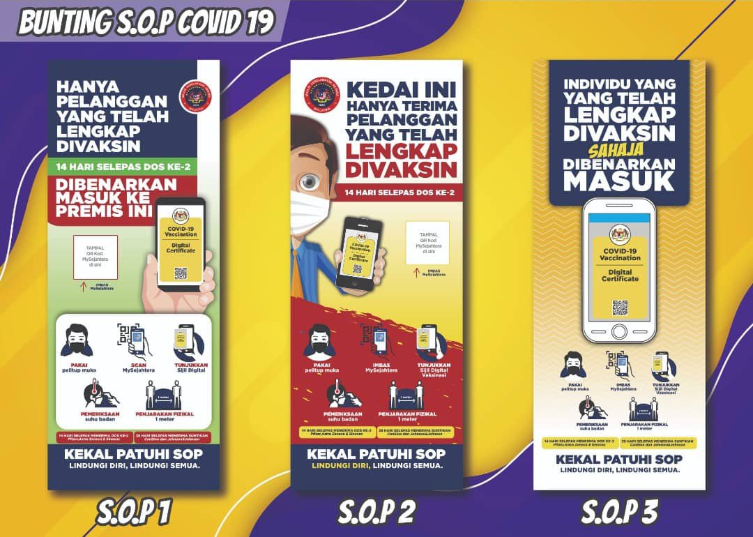 Wajib ada panduan S.O.P untuk pelanggan yang nak masuk premis anda. Mesti paparkan di depan kedai.