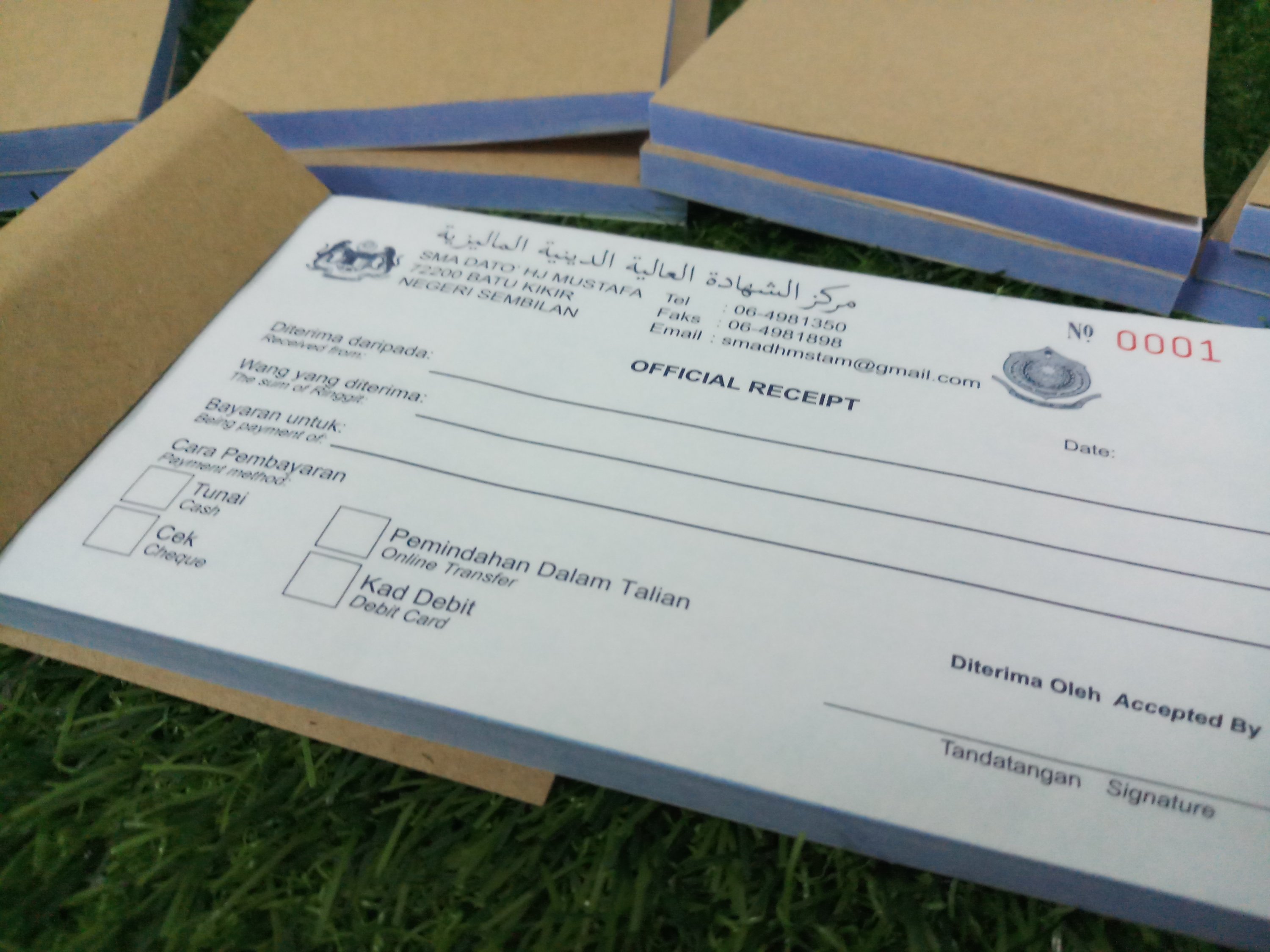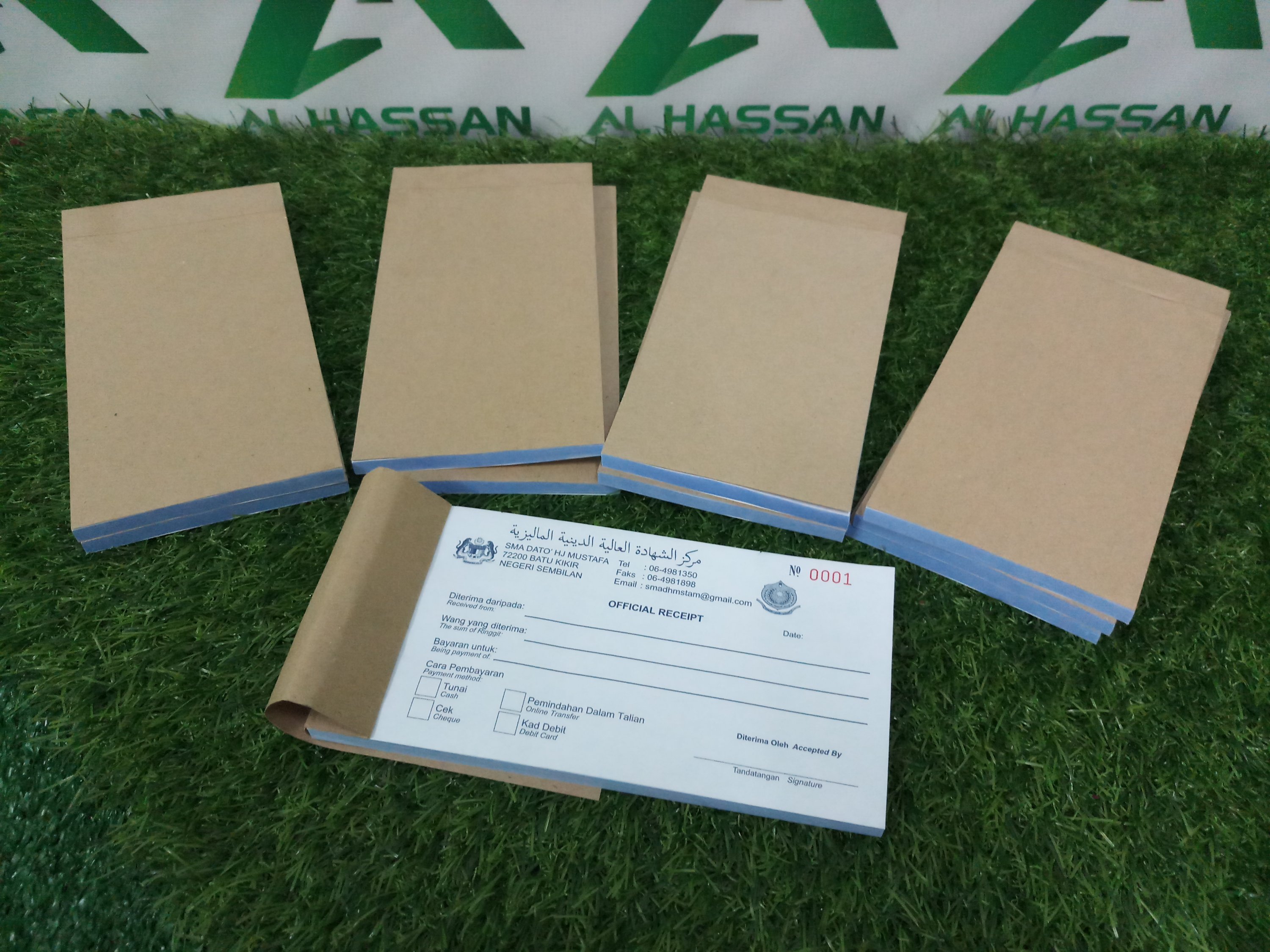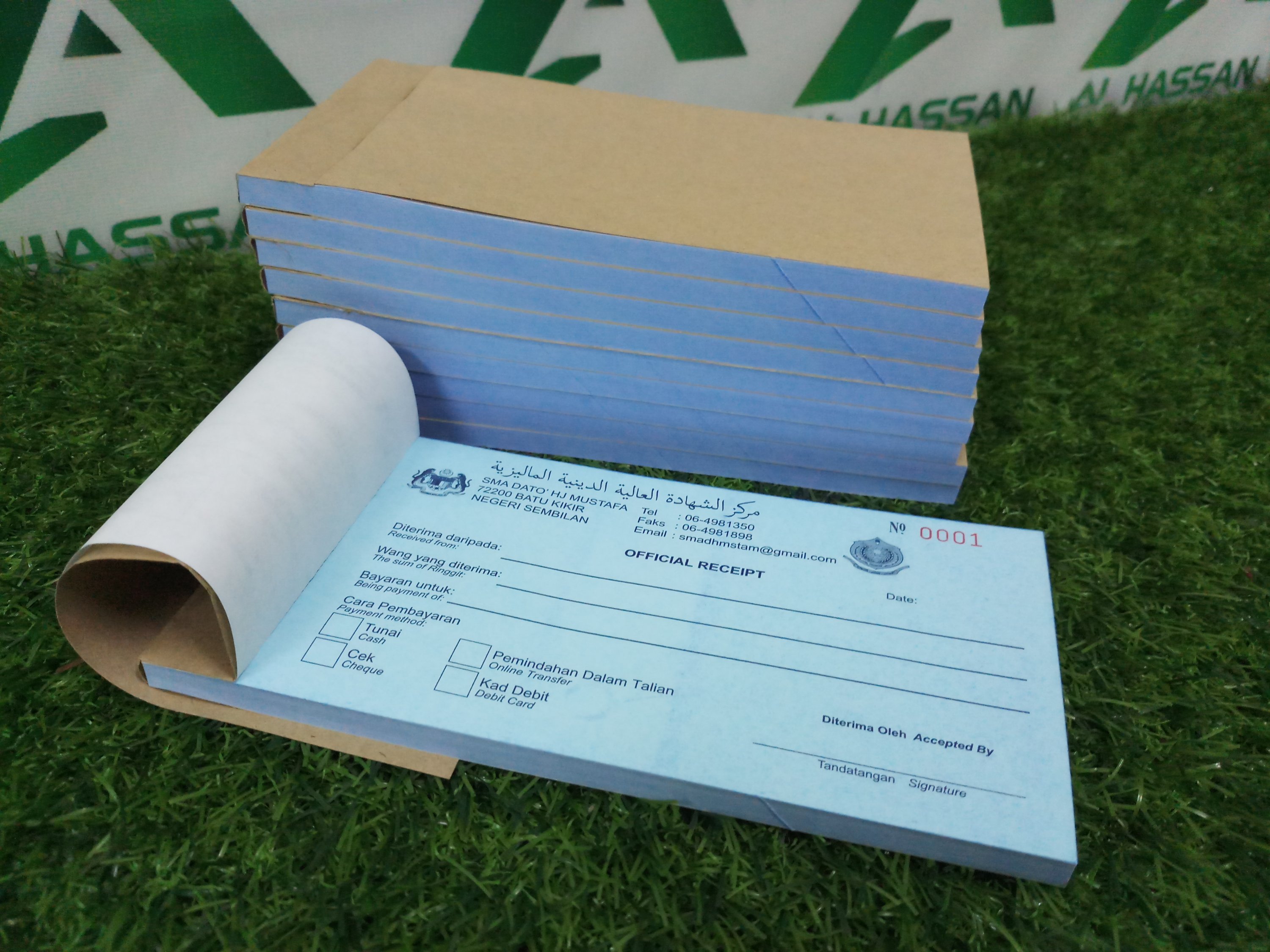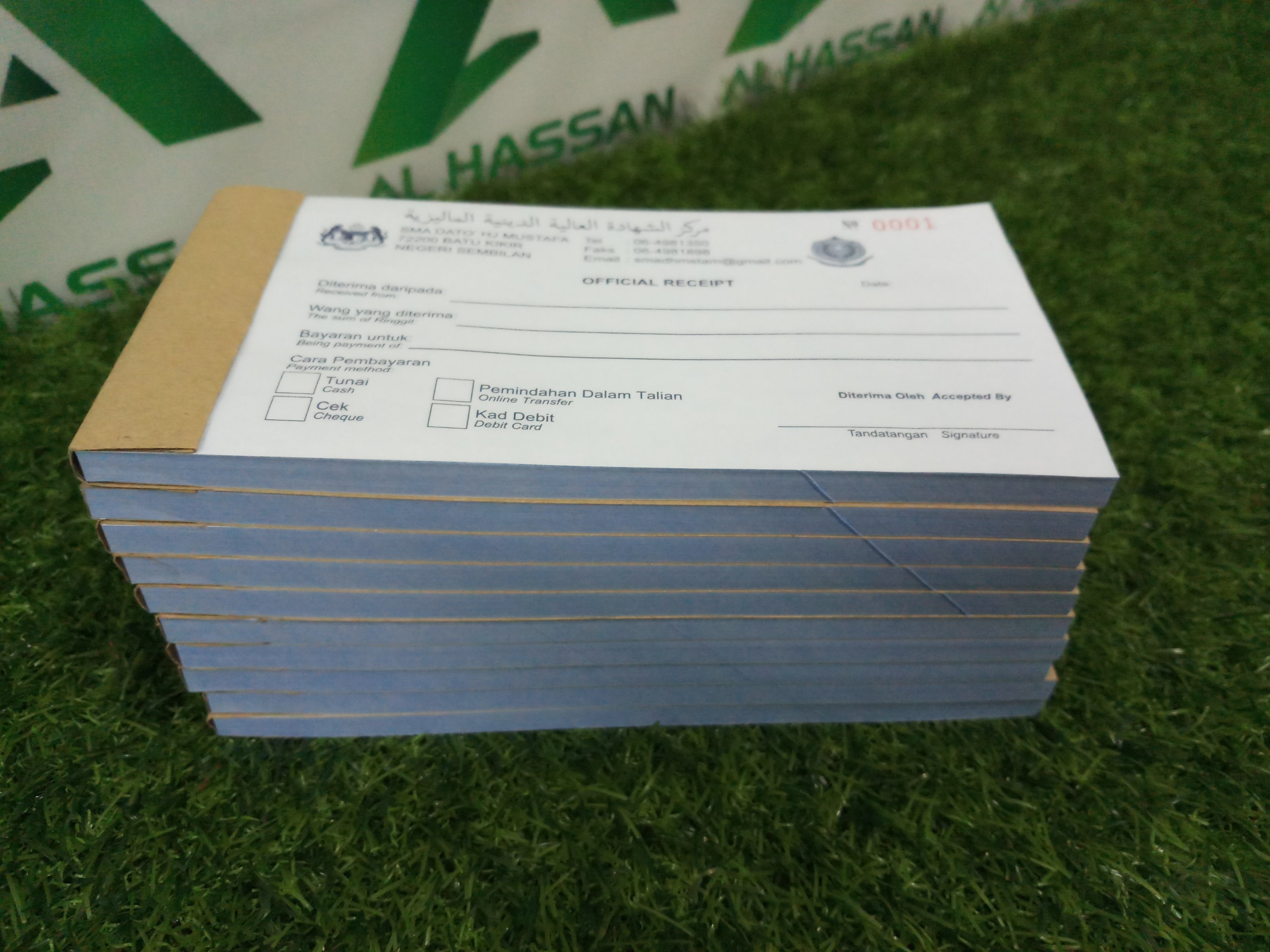 Custom buku resit boleh letak logo, alamat, nombor telefon dan lain-lain maklumat penting persatuan dan jabatan.