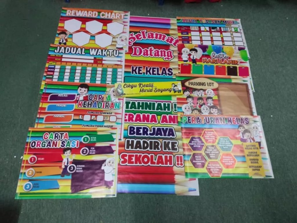Ada banner keceriaan jadual waktu, jadual tugasan murid, carta organisasi, peraturan kelas, banner motivasi dan macam-macam lagi..confirm ceria kelas cikgu nanti!