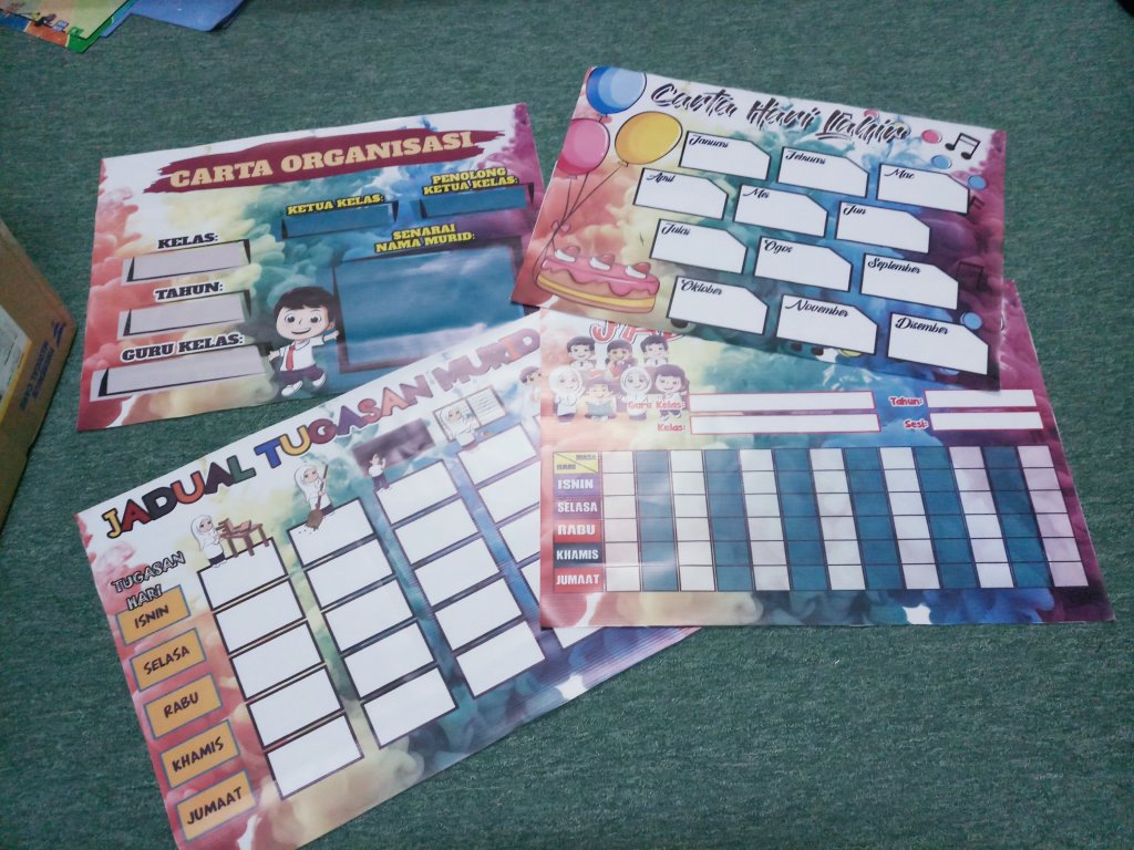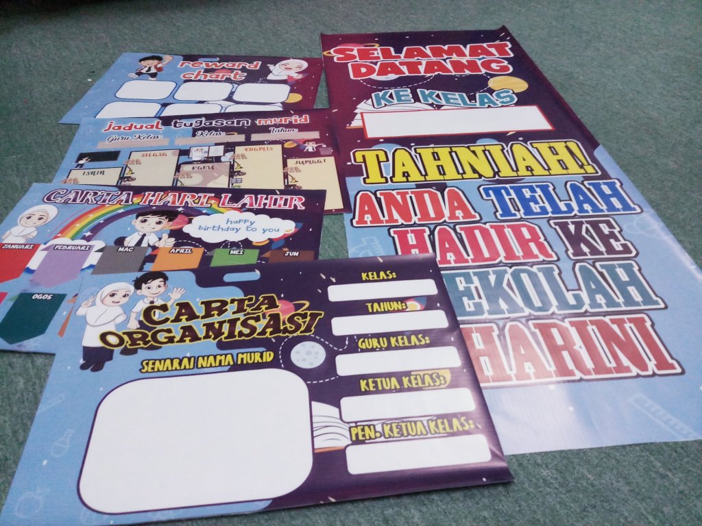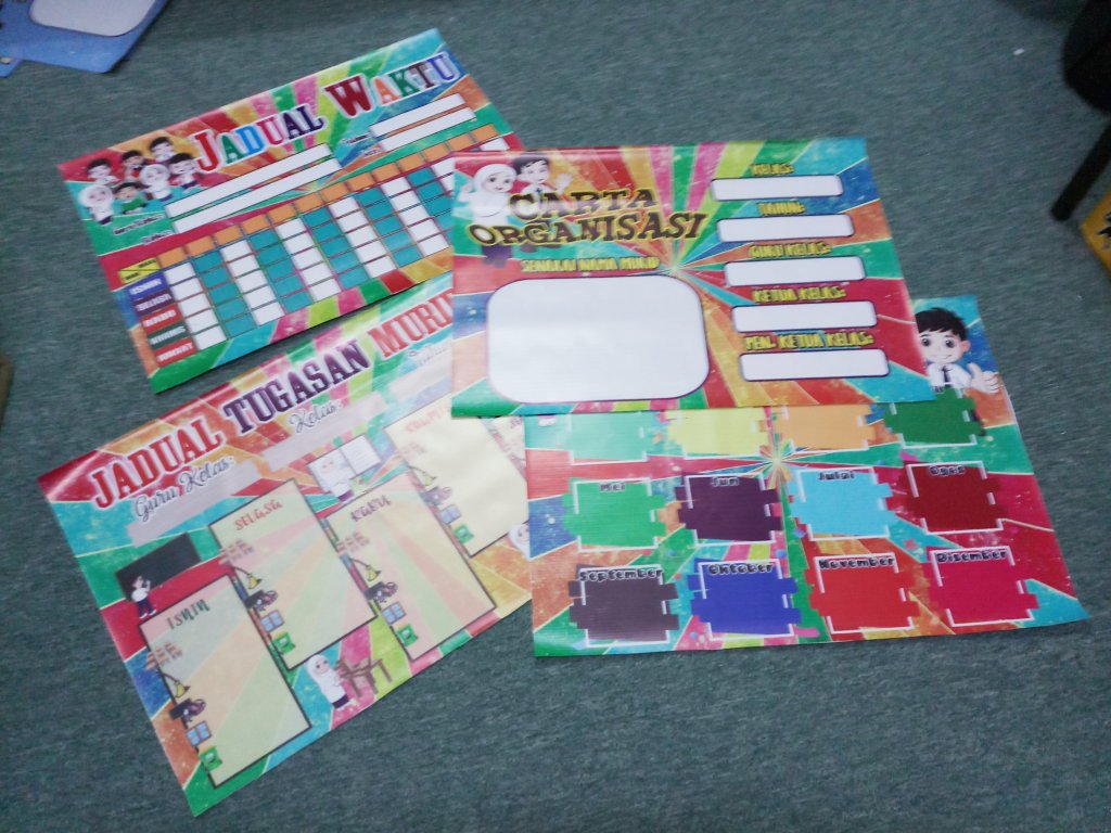 Ada banner keceriaan jadual waktu, jadual tugasan murid, carta organisasi, peraturan kelas, banner motivasi dan macam-macam lagi..confirm ceria kelas cikgu nanti!