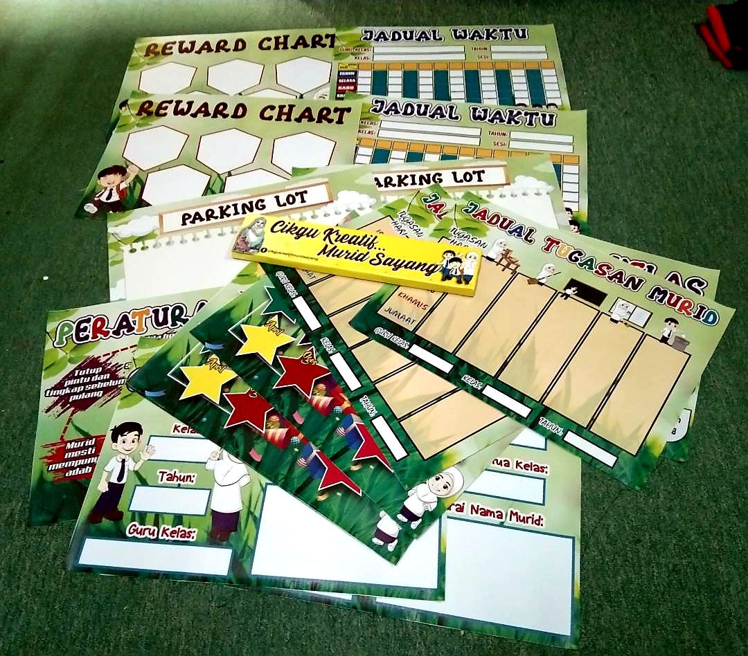 Ada banner keceriaan jadual waktu, jadual tugasan murid, carta organisasi, peraturan kelas, banner motivasi dan macam-macam lagi..confirm ceria kelas cikgu nanti!